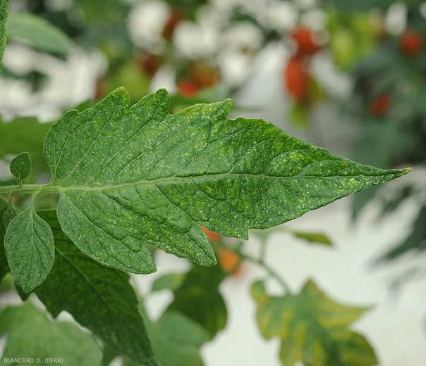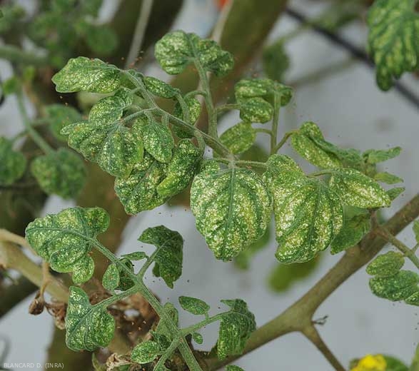 Tiny chlorotic spots more or less scattered on the lamina of tomato leaflets (Figures 1 and 2). The latter gradually turns yellow and takes on a dull color . In severe attacks, some leaves may turn yellow, wilt and dry out. Delicate silky webs are visible within the plant cover (figure 3).