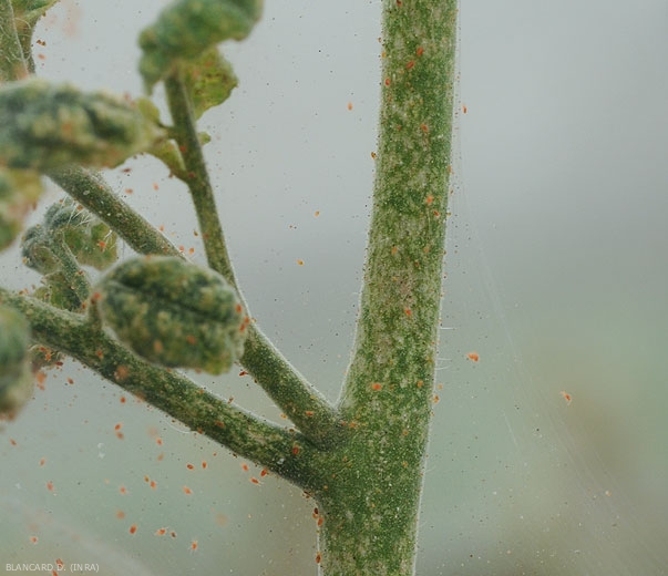 Mites ( mites ), which are part, like insects, of the phylum arthropods, belong to the class of Arachnids (spiders ). Adults have four pairs of legs, unlike insects which only have three. Several families of mites include plant pest species, the best known is that of Tetranychydae ; these species are commonly referred to as yellow, red or green “mites” or even “spiders”. Note that a few species attack tomatoes, including Tetranychus urticae (Koch) which is the most widely reported mite on this crop. Also called “tetranic weaver” ( spider mite ) because of the webs it forms on plants, it is cosmopolitan, common and very polyphagous since it has been reported on nearly 2,000 plant species. It can be responsible for significant damage, even lightning infestations, especially under shelters, this on many ornamental and vegetable crops. Resistance to acaricides has been repeatedly reported in this mite. Other species of Tetranychidae phytophagous , as well as predatory mites Phytoseiidae , can occasionally be found on tomatoes.