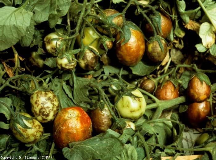 | Virus de la maladie bronzée de la tomate (Tomato spotted wilt virus, TSWV) | De larges taches, des anneaux, des arabesques couvrent partiellement les fruits. Ceux-ci peuvent être localement décolorés, bronzés et plus ou moins déformés. |