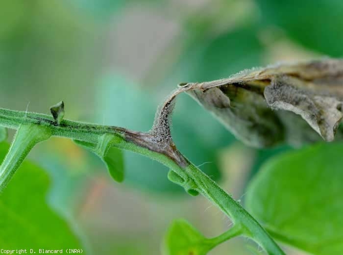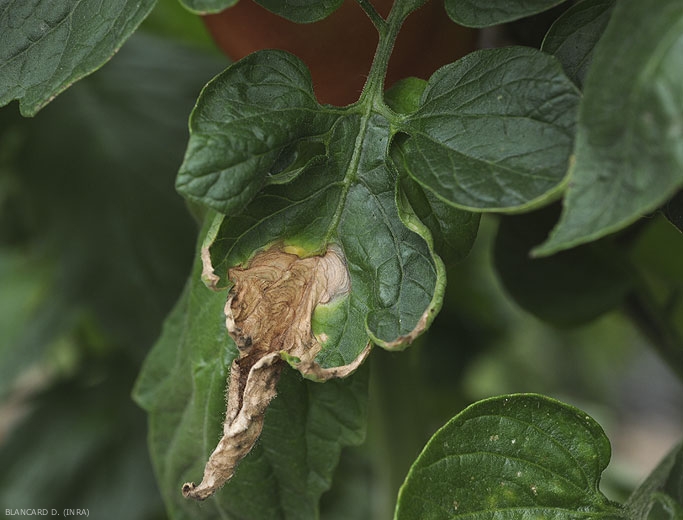The leaflets frequently show spots rather circular and moist at first (Figures 3 and 4). Hue beigeâtre to light brown , they also reveal an aspect parchment and reveal the concentric arabesques (Figure 5). They evolve rapidly and cause the drying out of important sectors of the blade (figure 6). These alterations can give rise to rot which then spreads and eventually injures entire leaves, with the tissues collapsing and necrosis gradually . Having gained the petioles (figure 7), this rot will be able to settle on the stem (figure 8).
