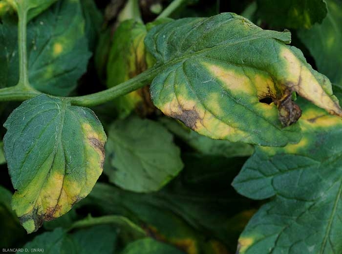 The plants affected by Verticillium dahliae frequently show a discreet wilting of lower leaflets at the hottest times of the day. At first, this wilting is reversible overnight. Subsequently, as the disease develops, it can be observed that certain sectors of the leaf blade, often interveinal and in the shape of a “V”, gradually soften and turn yellow (figures 1 to 5). Large portions of the leaflets eventually turn beige to brown and then necrose. Leaflets and leaves thus affected die prematurely, which can lead to exposure of the fruits to solar radiation and therefore the risk of solar burns .