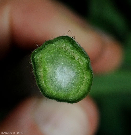 A longitudinal or transverse cut in the vessels of the lower part of the stem or of a branch shows that they show a slight browning , much less marked than in the case of fusarium (figures 6 and 7).