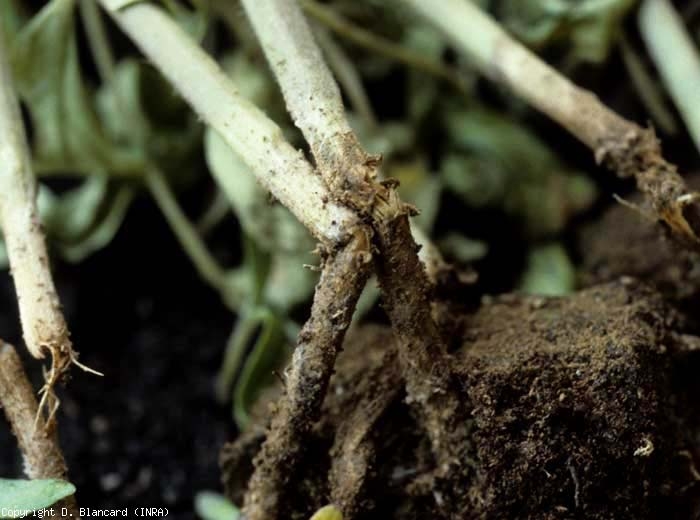 Several Phytophthora can cause similar symptoms in seedlings or young plants (Figures 4 and 5). For example, P. cryptogea is responsible for brownish to black lesions developing on the stem, at or near soil level, and eventually girdling it. Subsequently, adventitious roots emerge on the upper part of the stem while the roots end up rotting entirely. The leaflets may curl and gradually turn yellow.