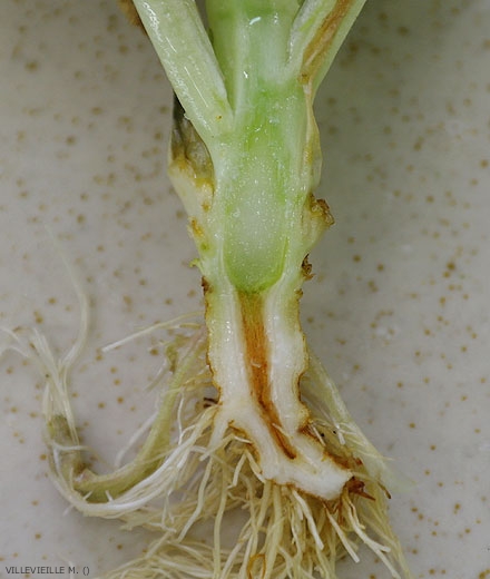 A longitudinal section of the roots, taproot and stem shows that the vascular system is affected. It reveals a brownish green tint that can be confusing with damage Fusarium .