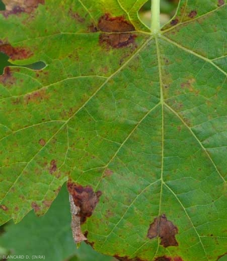Some grape varieties showing partial resistance to downy mildew can express symptoms with different facies. To see the particular forms that mildew can take on resistant grape varieties, consult the website of the national observatory of resistant grape varieties OSCAR .