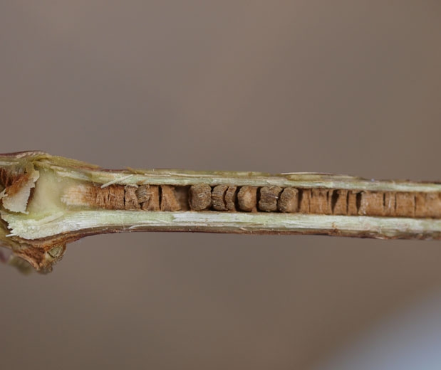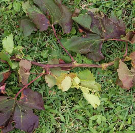 By making a longitudinal cut in the shoots, we see that they are dry and that the pith has browned and has retracted in places (Figures 4 and 5). Subsequently, shoots and clusters may completely wither away, and the vines may become defoliated.