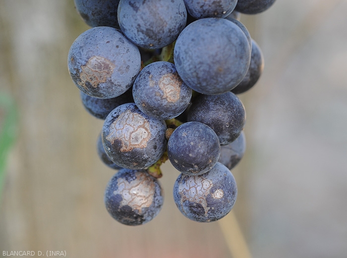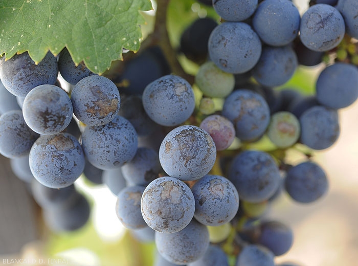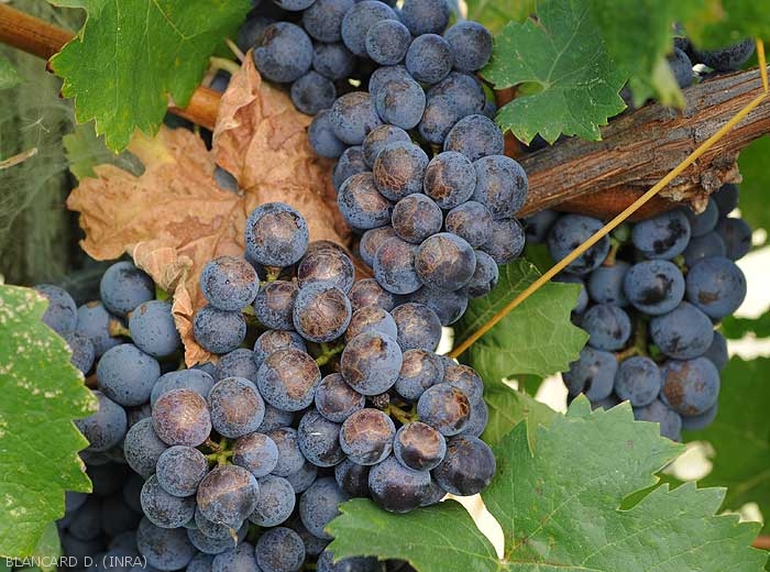 Sunburns are quite common in plants, as in vines. They appear on the herbaceous parts at temperatures above 42 ° C, and in particular the usually shaded organs. We can thus observe partial desiccations of the leaves , the blade of which turns brown and necroses over more or less extensive areas. On berries , it is essentially the side most exposed to the sun that is affected. Thus, a reddish brown lesion appears on one side of the fruit, subsequently the entire berry can dry out. If the stress is high, the cluster whole is affected.