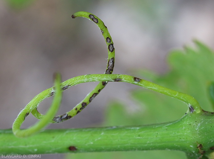 Localized and elongated lesions form on young herbaceous twigs which are particularly sensitive; moist, elliptical in shape and varying in color between brown, black and purple, they can modify the development of young shoots (Figure 8). They extend and progress in depth, reaching the marrow. At the end of the development, these lesions spread and become clearer in their center (figure 9); they can give rise to more or less marked and severe hollow cankers, making the twigs more brittle or causing them to dry out and die (Figures 10 and 11). Lesions on petioles and tendrils are identical (Figure 12). Such lesions can be observed on woods in winter (figure 13).