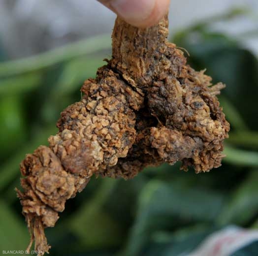 The two most reported species on melon, M. incognita and M. javanica , cause large galls sometimes covering the entire root system (Figures 3 and 4). Longitudinal swellings more or less tortuous and extensive are also observed (figure 5).