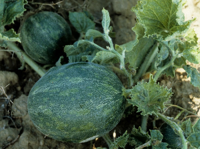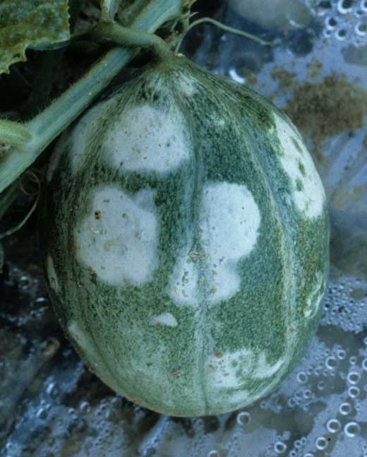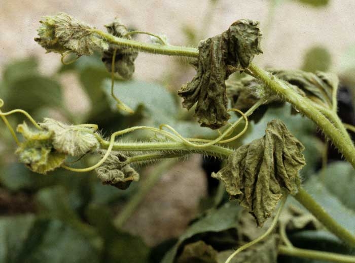 In addition, certain strains of ZYMV are responsible in a large number of commercial varieties of melon (possessing a particular gene, the gene Fn ) for very rapid wilting of the infected plant (Figures 6 and 7). The latter then dries up completely in a few days. This symptom may sound like an attack by Fusarium or another vascular pathogen, but in this case the vessels of the neck or stem remain intact.