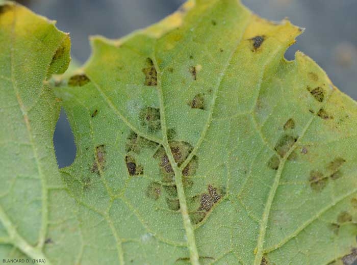 Pseudoperonospora cubensis grows mainly on the leaves of cucurbits. It causes leaf spots more or less wide which may present some common points but also some differences, this depending on the parasitized species and the climatic conditions in particular: