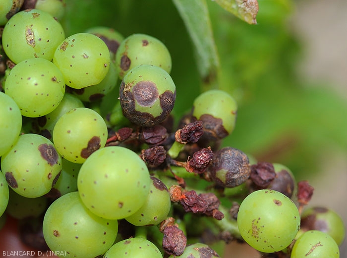 Many berries of this cluster are affected by dark circular spots, sometimes confluent, caused by <i> <b> Elsinoë ampelina </b> </i> responsible for anthracnose on vines.