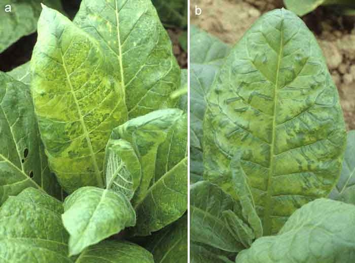 Significantly different symptoms are observed on plants of different types of tobacco infected with CMV, at times these symptoms remind those caused by TMV (tobacco mosaic virus) (figures 1 to 9):