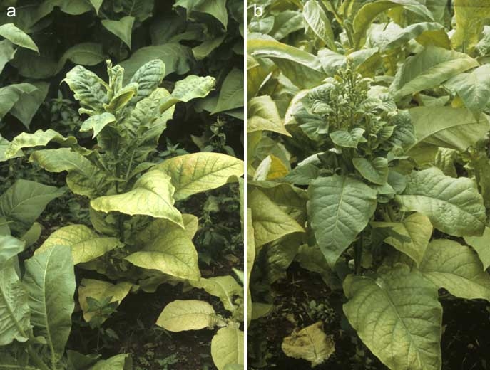 In general the first symptoms of stolbur appear in August, when tobacco approaches flowering. At this stage of culture, tobacco plants are topped and the axillary buds are inhibited chemically. The first symptom of the disease begins by the yellowing between the veins, a symptom that occurs most frequently on mature or intermediate leaves. Gradually yellowing expands to the whole plant (figures 1 and 2). In case of dark tobacco, vein and interveinal necrosis are sometimes accompanied by a slight chlorosis of lamina; the resulting syndrome may be confused with that caused by certain necrotic strains of PVY (figure 3). Subsequently the discoloration is so pronounced that the lamina becomes completely white. This symptom may be the origin of what the old tobacco farmers observed and sometimes referred to as "white feet" (figure 4). This abnormal colour is not the most characteristic of the symptoms, yet it could be the source of much confusion with the symptoms caused by nutritional disorders.