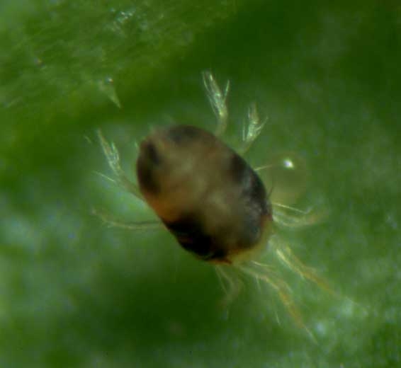 The eggs (1) (figure 3) are laid mainly on the underside of the leaflets. They are round, tiny (0.14 mm in diameter), translucent at first, then become opaque, and eventually turn yellow as they approach hatching. The larvae (2) (figure 4), which have 3 pairs of legs, are initially very pale, then take on a greenish tint. They have two red eye spots as well as two dark spots in the middle of their body. The protonymphs larger (3) have four pairs of legs and vary in color from light green to dark green; they also have two more contrasting spots on their body. The deutonymphs (4) are larger than the protonymphs but of the same color. It is at the stage adult (5) (figures 5 and 6) that we can distinguish males from females: the female, oval, measures 0.5 to 0.6 mm in length. Its color is variable (orange, light yellow, light green to dark green, even red). The male is more active, smaller and narrower than the female. It also has a variable color (light yellow to orange, dark yellow to brown). On tomato, T. urticae is frequently reddish.