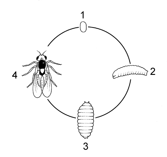The eggs (figure 3-1), cream-colored and oval in shape (those of Liriomyza bryoniae measure 0.12 x 0.27 mm), are deposited in the tissues during the spawning bites using the ovipositor females. A female can produce several hundred eggs which subsequently hatch and give birth to larvae transparent and 0.5 mm long (Figure 3-2) (Figure 2). These dig galleries in the leaflets that the presence of black excrement makes clearly visible. The 2.5 mm long, third instar white larvae pierce the blade, leave the leaflets, drop into plastic folds or onto the ground, and bury shallowly. Subsequently, they transform into pupae (Figure 3-3) barrel-shaped and vary in color as they age from yellow to dark brown (Figures 3 and 4), blackish pupae are often the ones that are parasitized. The pupation of Chromatomyia horticola takes place in the leaf: the puparium, covered by the epidermis of the leaf, is then visible in the form of a small protuberance at the end of the larval gallery. The adult (Figure 4-4) are small flies of 2 to 3 mm long, yellow and black ( Liriomyza spp., 5) or dark gray (C hromatomyia horticola ). The adult females, present on the upper surface of the limbus, perforate the epidermis thanks to the real auger that is their ovipositor, suck the vegetable juice (nutritional bite) and deposit their eggs (egg-laying bites). Note that the males, devoid of augers, also take advantage of the feeding bites to feed themselves.