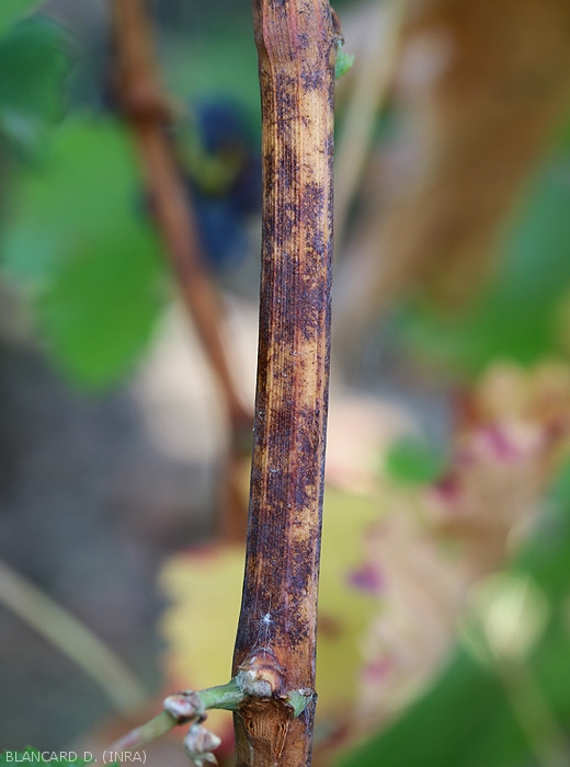 Young twigs are also colonized by E. necator . Covered by its mycelium, they present spots, even irregular and ill-defined areas more or less powdery. The hardening of oidized twigs is often partial and in the fall, the areas affected by E. necator take on a brownish to blackish tint that is always visible during the winter (Figures 7 and 8).
