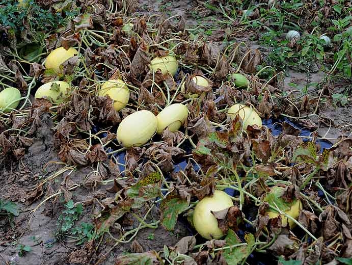 In addition, late blight progresses very rapidly on leaves, plants and in plots. The melon leaves dry out completely and remain attached to the plant, erect and rolled up (Figures 10 to 13).