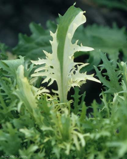 Sectoral yellowing and whitening of the blade of several leaves on lettuce.  <b> Genetic anomaly </b>