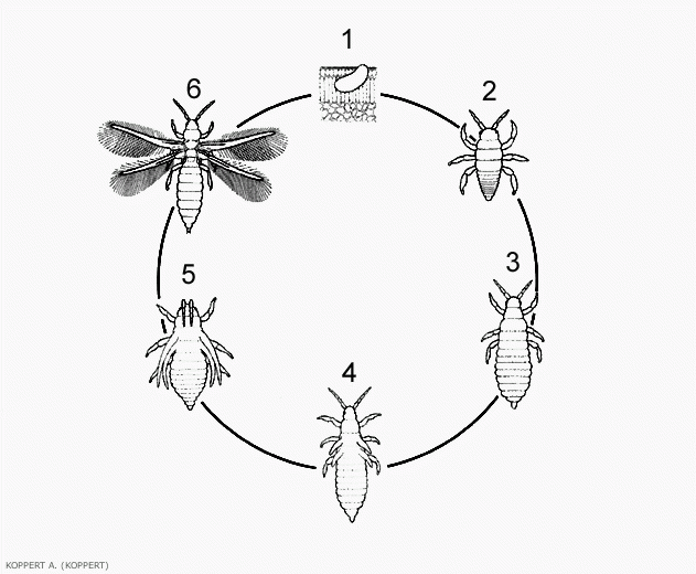 El ciclo de desarrollo de los trips comprende 6 estadios (figura 3): huevo, dos estadios larvarios, dos estadios de proninfa y adulto (figura 5). La duración del ciclo varía según la temperatura y la planta huésped; por ejemplo, para F . occidentalis fluctúa de 34 días a 15 ° C a 13 días a 30 ° C.