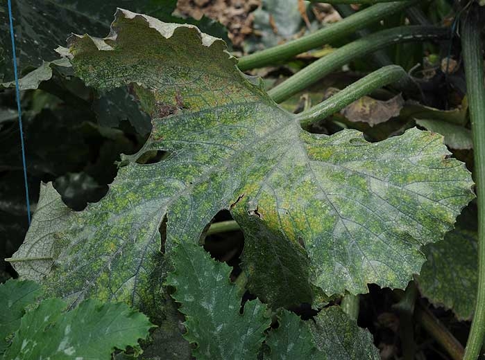 El daño de Tetranychus urticae en calabacines y calabacines se manifiesta por la aparición de diminutas manchas cloróticas más o menos dispersas en la lámina de la hoja (Figuras 1 a 4). Este último gradualmente se vuelve amarillo y adquiere un color apagado .