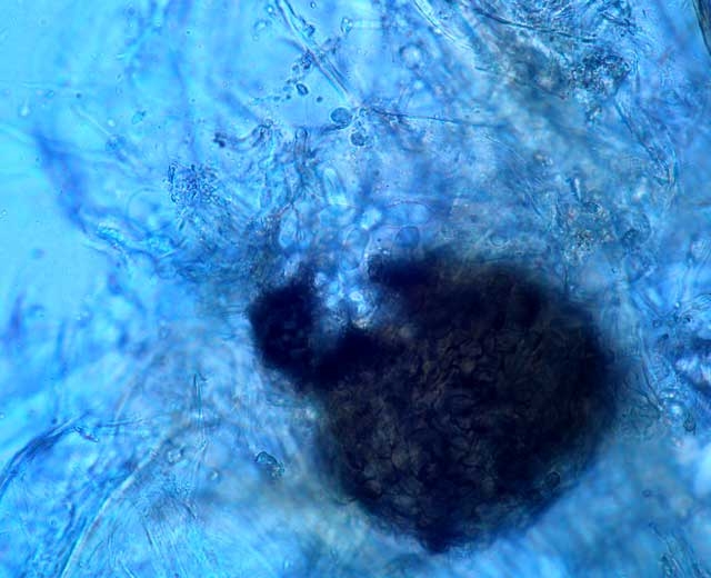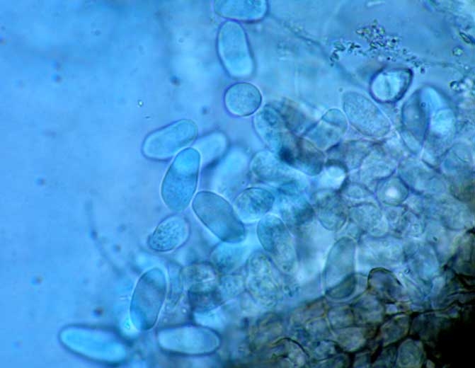 También puede formar picnidios globulares (figura 7), con ostiolos truncados, que producen conidios hialinos, elipsoides u ovalados que miden 16-29 x 6-9 µm (figura 8).