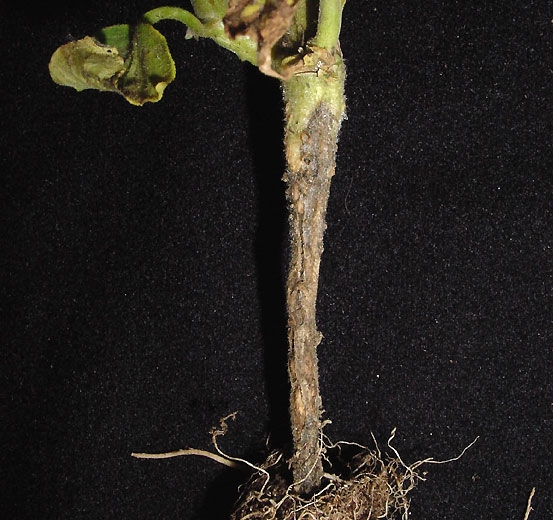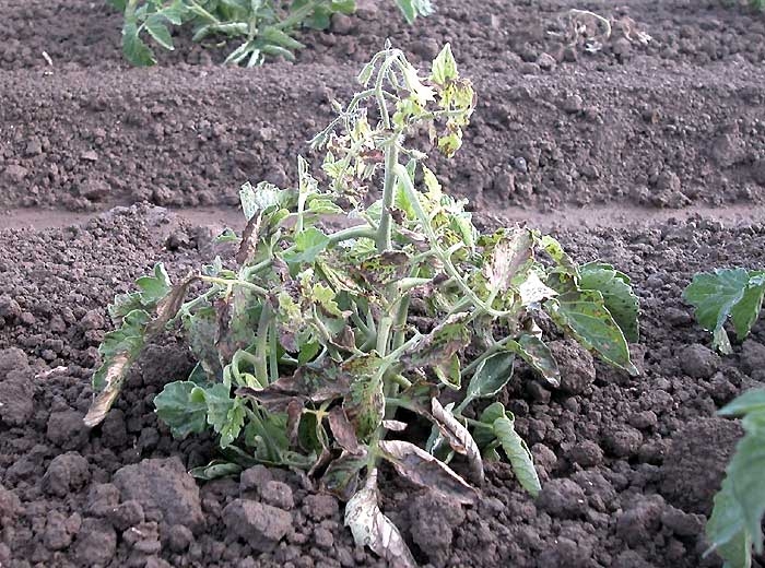 Alternaria alternata f. sp. lycopersici causa principalmente cancros en tallos más o menos alargados ( Alternaria cancro del tallo de ), ubicados cerca del suelo (figura 1). De color marrón a beige oscuro, de consistencia seca, tienen patrones concéntricos. Los vasos subyacentes muestran un pardeamiento más o menos localizado. Estos cancros eventualmente rodean el tallo, causando la muerte de la planta. Al colonizar el tallo, este hongo también produce una toxina que se difunde en la planta y provoca clorosis de la lámina y la aparición de numerosas manchas interveinales necróticas, de color marrón a negro, más o menos angulares (figura 2).