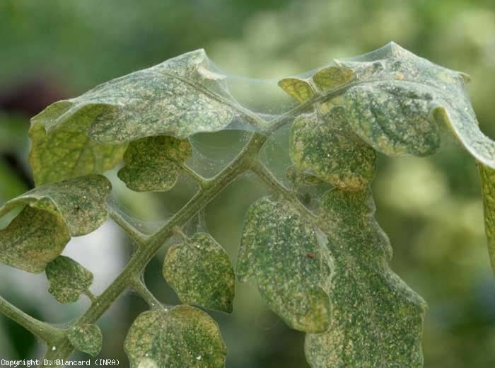 De minuscules taches chlorotiques plus ou moins dispersées sur le limbe des folioles  de tomate (figures 3 et 4). Ce dernier jaunit progressivement et prend une teinte terne. Lors d'attaques sévères, certaines feuilles peuvent jaunir, flétrir et se dessécher . De délicates toiles soyeuses sont visibles au sein du couvert végétal  (figure 5).