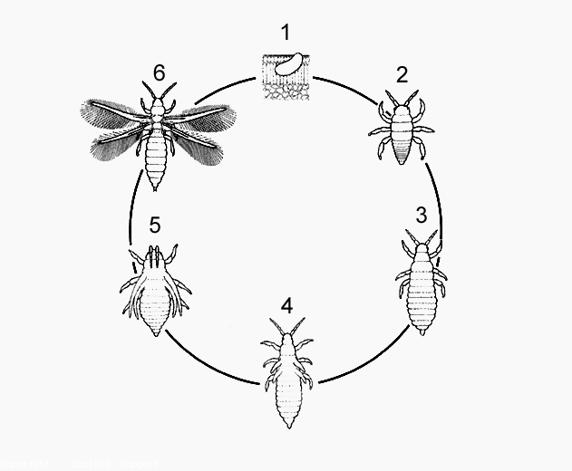 El desarrollo de los trips comprende 6 estadios (figura 7): huevo, dos estadios larvarios, dos estadios de proninfa y adulto (figura 7). La duración del ciclo varía según la temperatura y la planta huésped; por ejemplo, para F . occidentalis fluctúa de 34 días a 15 ° C a 13 días a 30 ° C.