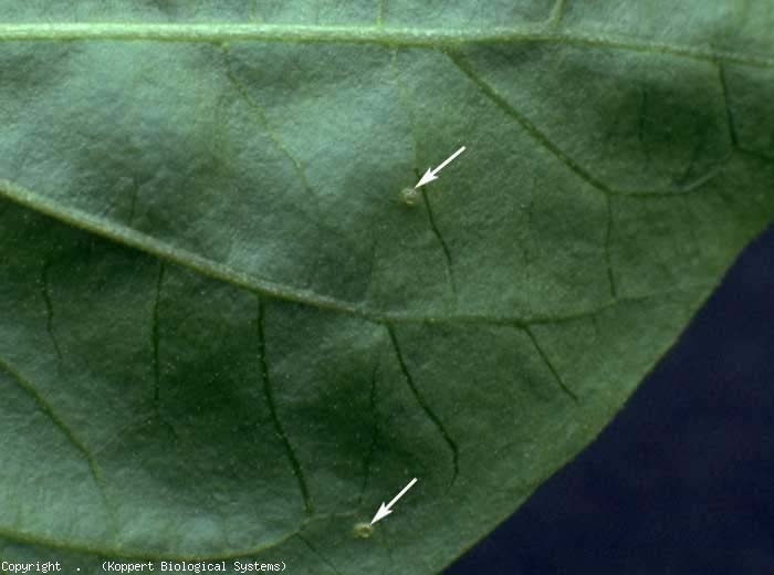 - Etapas de desarrollo : los huevos en forma de riñón (figura 7-1) (figura 8) se depositan sobre los órganos aéreos, especialmente las hojas del tomate. Una vez formadas, las larvas (Figura 7-2 y 3) (Figura 9), que son muy móviles, se alimentan del envés de las hojas. Al final del segundo estadio larvario (Figura 7-3), caen al suelo y pupan. La primera etapa de proninfa (Figura 7-4) se caracteriza por la aparición de contornos de alas. La segunda etapa, más clara, pronymphal (Figura 7-5) también muestra contornos de alas más grandes y antenas largas que se curvan hacia la parte posterior del cuerpo. Los adultos (Figura 7-6) tienen 2 pares de alas bien desarrolladas.