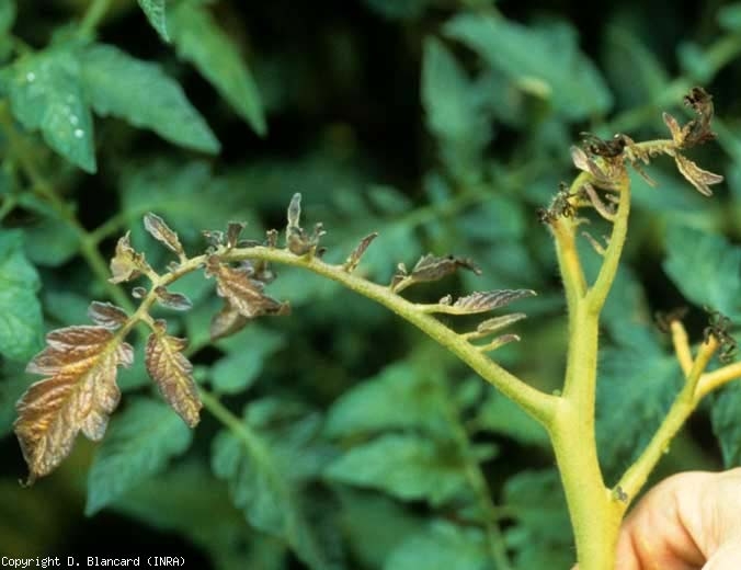 Los fitoplasmas que atacan al tomate provocan diversos síntomas en los órganos aéreos, jóvenes y en crecimiento, de esta solanácea. En Francia, a menudo aparecen durante el mes de julio o incluso a principios de agosto. A partir de este período, el crecimiento de las plantas afectadas a menudo se ralentiza . Los ápices forman entrenudos más cortos y hojas más pequeñas, a veces enrolladas. Los tejidos de la lámina suelen ser más gruesos e incluso quebradizos (Figuras 1 a 3).
