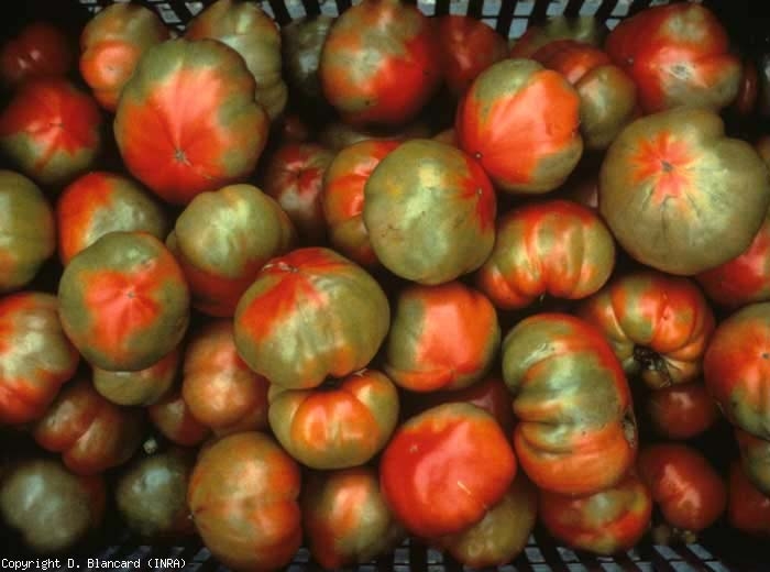- el virus de doble racha , que combina TMV y PVX, puede ser la causa de lesiones marrones, extendidas en tallos y pecíolos, irregulares en frutos;