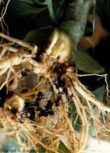- la raíz principal puede mostrar un estrechamiento, las raíces secundarias están necróticas y ligeramente suberizadas.