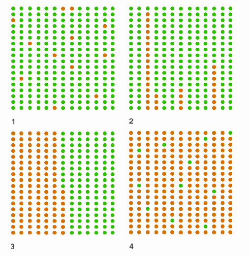 - Si le composé est présent dans le sol sous la forme de résidus (herbicide racinaire...), la répartition des plantes affectées pourra être généralisée et plus ou moins homogène (figure 1.4), répartie au hasard sur l'ensemble de la parcelle (figure 1.1).