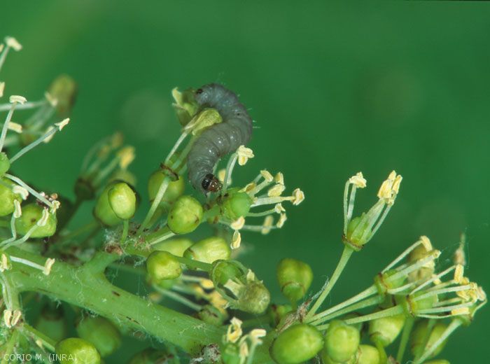 Les oeufs de Lobesia botrana sont assez semblables de ceux de la cochylis. Ils ont la forme de lentille et sont pondus isolés, puis collés sur la surface de la baie. La distinction des oeufs entre les deux tordeuses n'est toutefois fiable qu'après quelques jours d'incubation. Les oeufs d'eudémis sont beiges, légèrement irisés (figure 1).