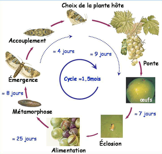 L'oeuf incube durant une dizaine de jours avant de voir l'éclosion de la larve néonate (jeune chenille). La chenille présente un stade errant, dit « stade baladeur » de moins de 24 h après lequel elle perfore un bouton floral puis les voisins qu'elle agglomère en tissant un fil soyeux pour former le « glomérule ». Cette sorte de nid grossira au fur et à mesure du grossissement de la chenille qui passera par cinq stades larvaires successifs protégée à l'intérieur du glomérule. Le terme de son développement correspond en général à la floraison où les glomérules sont facilement reconnaissables. La chenille quitte alors le glomérule et l'inflorescence pour trouver son lieu de nymphose (anfractuosités du cep, sol, bord des feuilles). La larve nymphose après avoir tissé un cocon blanchâtre de protection extérieure. La nymphose dure une semaine à une dizaine de jours.