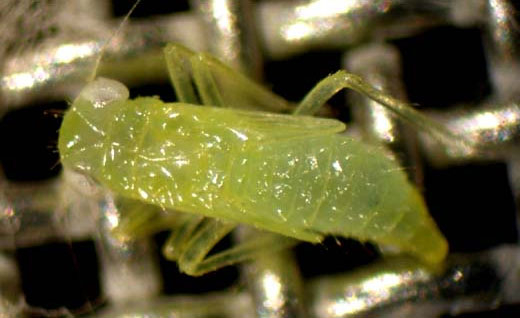- La larva en eclosión pasa por 5 estadios larvarios diferenciados por el tamaño y forma de los individuos así como por el desarrollo de las alas. Las larvas del primer estadio son blancas, pequeñas y no tienen alas. Durante las etapas sucesivas, las larvas se vuelven verdes, a veces rojizas, y presentan contornos de alas bien desarrolladas desde el penúltimo estadio. Se mueven rápidamente como "cangrejo" (oblicuamente) y se ubican en la parte inferior de las hojas.