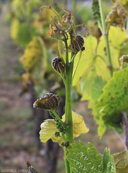 En las plantas pueden aparecer desórdenes más o menos graves cuando las temperaturas bajan de cierto límite, en ocasiones se vuelven fatales para la vid. Por lo tanto, las heladas pueden ocurrir en invierno, principios de otoño, pero también a finales de primavera. Las temperaturas negativas significan que parte del agua de los tejidos escapará de las células y formará cristales en el espacio entre membranas, provocando su destrucción. Luego, la lámina se contrae y se ampolla en la superficie superior, mientras que la superficie inferior está tensa y, a veces, se desgarra.