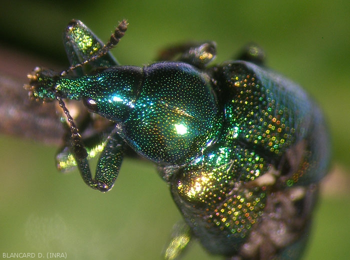 • Byctiscus betulae pasa el invierno como adulto (figura 1) ubicado de 8 a 10 cm de profundidad en el suelo al pie de los tocones, o debajo de la corteza del tronco. Salen de la hibernación entre mediados de mayo y principios de junio, tienen una actividad diurna y se alimentan de los órganos verdes de la vid.