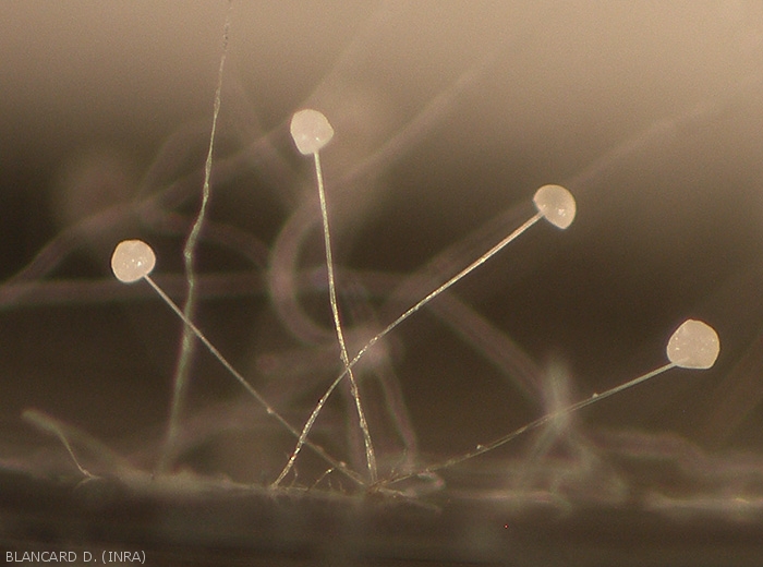 • Los esporangióforos marrones están aislados o agrupados en escasos mechones. Hasta 3,5 mm de largo y 20-34 µm de ancho, estas estructuras, en cuyo extremo están los esporangios , son fácilmente visibles con una lupa binocular. Los esporangios aparecen como vesículas globulares negras con un diámetro de entre 40 y 350 µm, con una base aplanada.