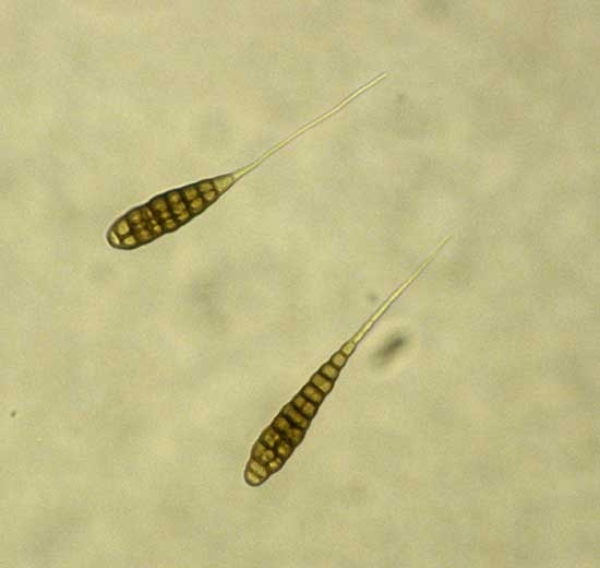 - Esporulación : producida en los tejidos colonizados, numerosos conidióforos cortos coronados por conidios multicelulares largos.