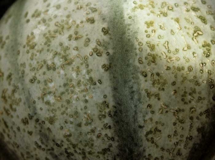 Los frutos de melón presentan con frecuencia pequeños cambios superficiales muy característicos que los productores atribuyen erróneamente a daños por plagas (picaduras de trips, etc.). Este no es el caso, estos síntomas de ninguna manera son causados por un insecto. La elevada humedad que impera bajo los distintos refugios (túneles, orugas ...) y en particular bajo la cubierta vegetal está en el origen de este último.