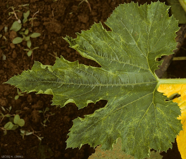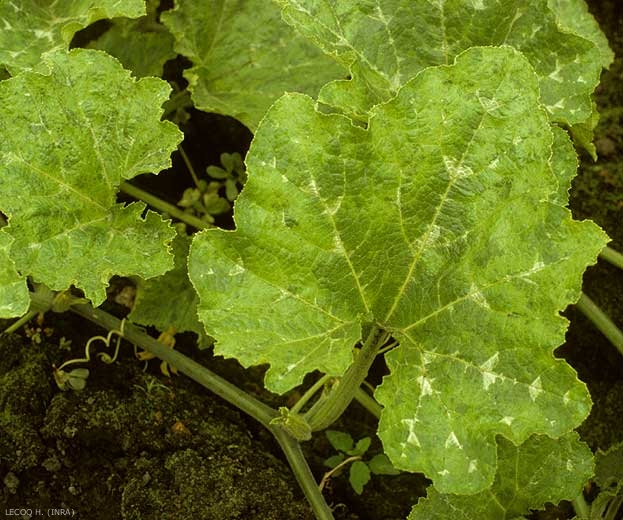 Estos síntomas también pueden confundirse con los del del virus del mosaico amarillo calabacín virus del mosaico (ZYMV) o con cepas graves del de la sandía (WMV). A veces se observa una coloración plateada de la lámina de la hoja (Figura 6).