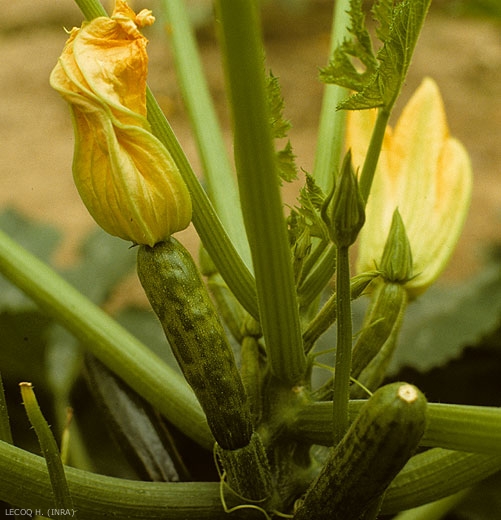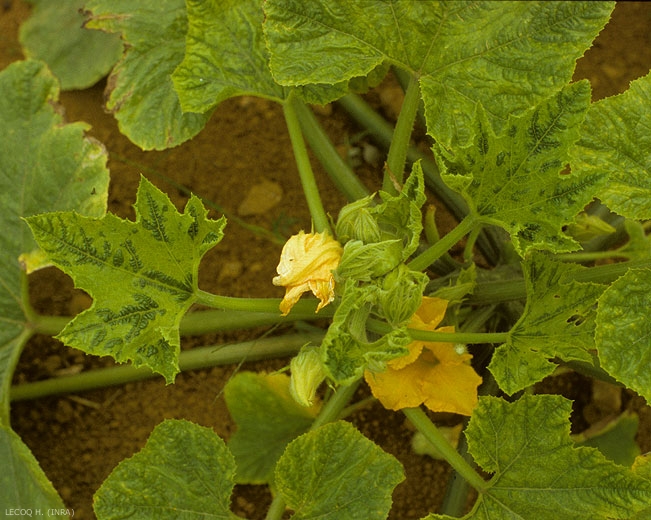En el calabacín, este virus con mayor frecuencia causa síntomas foliares fuertes de mosaico (Figuras 1 a 3 y 9 a 11) a veces muy deformantes, de hecho acompañados de ampollas (Figura 4), filiformismo (Figura 5).