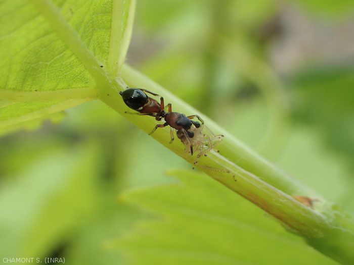 - Thomisidae , o arañas cangrejo que cazan al acecho. Estas arañas se pueden reconocer por sus dos pares de patas delanteras muy desarrolladas (foto 1). En esta familia, Misumena vatia destaca especialmente en flores y su coloración varía según el medio en el que se encuentre. Synema globosum , una especie muy común en el viñedo, se caracteriza por un fuerte dimorfismo sexual (foto 10). Esta especie pone sus huevos en un capullo tejido en una hoja doblada.