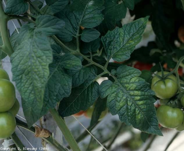 | Tomato chlorosis virus (ToCV) | Marbrure chlorotique irrégulière, jaunissements internervaires en taches dans un premier temps, se généralisant par la suite à l'ensemble du limbe des feuilles basses. Ces dernières, les plus touchées, deviennent dures et cassantes. Les plantes sont moins vigoureuses et la maturité des fruits est retardée. |