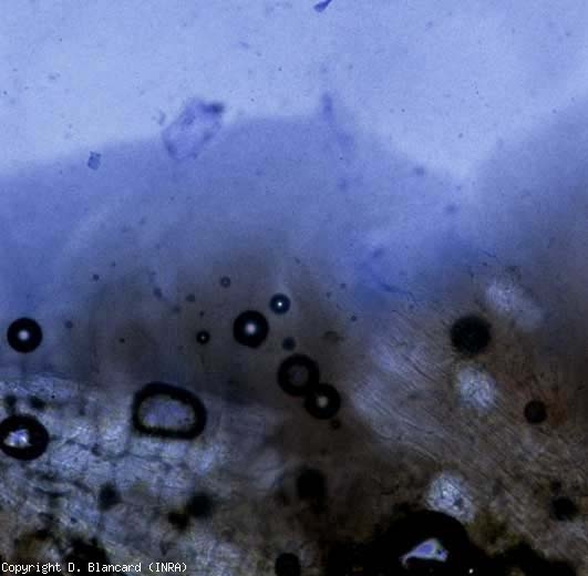 - des portions de vaisseaux altérées, observables après avoir réalisé une coupe longitudinale ou transversale de la tige. Ainsi, des lignes crémeuses, blanchâtres à jaunes, brunissant progressivement, sont visibles le long des vaisseaux et sur les tissus corticaux et la moelle proches (figures 4 et 5). En fonction des situations, les symptômes internes à la tige peuvent être très difficiles à détecter et nécessiter des coupes sur toute la longueur de la tige ou, au contraire, être particulièrement marqués avec des stries brunes vasculaires bien visibles. Une observation au microscope photonique de coupes histologique réalisées dans la zone vasculaire de la tige permet de constater la présence d'un mucus bactérien (figure 6) ;
