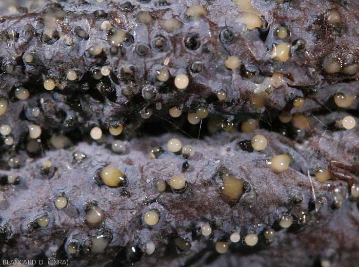 Los picnidos maduros son muy numerosos en madera blanqueada (Figura 1) y lesiones viejas y bayas momificadas (Figura 2). Durante los períodos primaverales húmedos y lluviosos, masas de conidios (esporas α y β) (Figura 3) escapan de los picnidos en forma de cirros (Figuras 4 y 5) y muchas conidias contaminan los brotes jóvenes como resultado de salpicaduras de agua.
