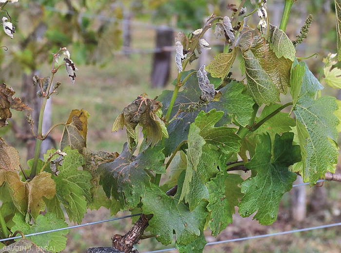 - Las heladas primaverales se producen cuando las vides reanudan su actividad. Los síntomas son variables y dependen del estadio vegetativo. Al brotar, lasyemasyramitas quemiden unos pocos cm se vuelven marrones y se secan (figuras 1 a 12). Si la helada es intensa, puede haber destrucción total de la vegetación que se vuelve marrón después del deshielo y toma la apariencia de una ensalada cocida, antes de secarse (Figuras 3, 4, 7 y 10). Las inflorescencias también se vuelven marrones y secar (Figuras 4 y 5). Si la helada es débil, solo se ven afectadas las hojas altas y el ápice (Figura 1). Recuerda que se conocen 2 tipos de heladas primaverales: