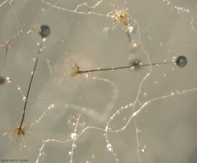 El micelio de Rhizopus stolonifer consiste principalmente en hifas sifonizadas que crecen rápidamente. Es a partir de estas hifas marrones que los desarrollan corredores , características hifas curvas, en el origen del nombre de especie de este Rhizopus . Cuando los corredores entran en contacto con el sustrato del hongo (aquí: el racimo), entonces producen rizoides ramificados (figuras 1 y 2) de los cuales los esporangióforos saldrán en la dirección opuesta (figuras 3 a 7).